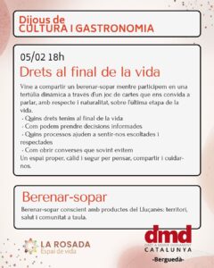 Per això, aquest dijous us convidem a Drets al final de la vida, una trobada on parlarem, jugarem i compartirem taula. Un espai per desfer tabús, crear nous relats i acostar-nos a aquest moment de la vida amb més consciència i serenor.